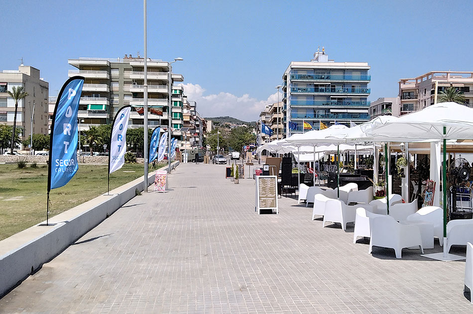 Aplicamos el diseño de la marca sobre un conjunto de 6 “Beach Flags” colocadas sobre el murete perimetral de separación, con el objetivo de posicionar el puerto visto desde la playa de Segur de Calafell.