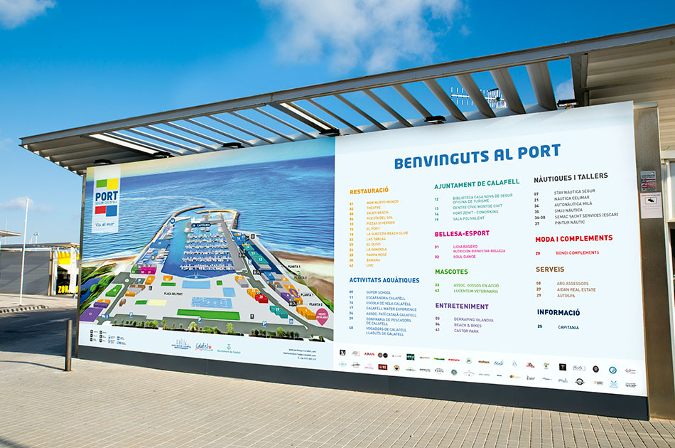 Diseñamos un directorio comercial de grandes dimensiones para informar y ayudar al usuario a encontrar los equipamientos públicos y locales comerciales de todo el recinto marítimo, con la idea de mostrar de un solo vistazo toda la oferta que ofrece Port Segur-Calafell.