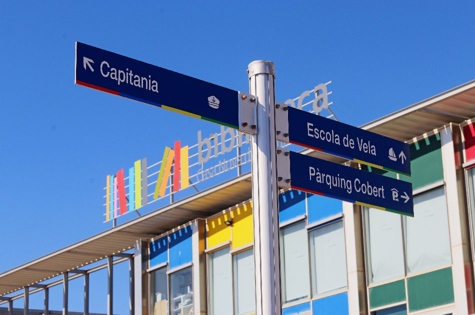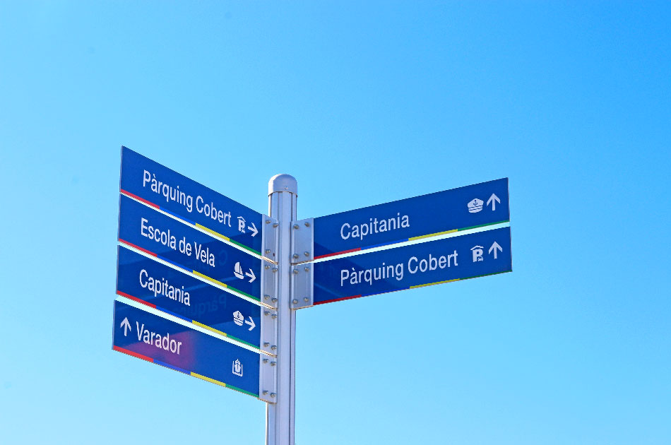 Postes de señalización vertical con indicaciones de ubicación de zonas del puerto tales como la capitanía del puerto, la escuela de vela de Calafell, el varadero y el parking cubierto.